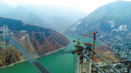 6日上午10時(shí)許,興康特大橋施工現(xiàn)場一片繁忙。這是一座鋼桁梁懸索橋,選擇這種橋型很有講究。四川省交通運(yùn)輸廳公路設(shè)計(jì)院總工程師牟廷敏說,由于大橋處于大渡河峽谷,周邊施工條件有限,無法有效展開大型機(jī)械,加上抗震、抗風(fēng)的需要,因此被設(shè)計(jì)為懸索橋。
