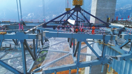 6日上午11時(shí),現(xiàn)場指揮工長一聲令下,大橋康定端最后一個(gè)鋼桁梁開始吊裝。提前組裝好的鋼桁梁,被大型機(jī)械吊起后緩緩向上移動(dòng)……11時(shí)18分,隨著最后一段鋼桁梁被吊裝到位,和兩側(cè)鋼桁梁對接固定,興康特大橋宣告成功合龍。