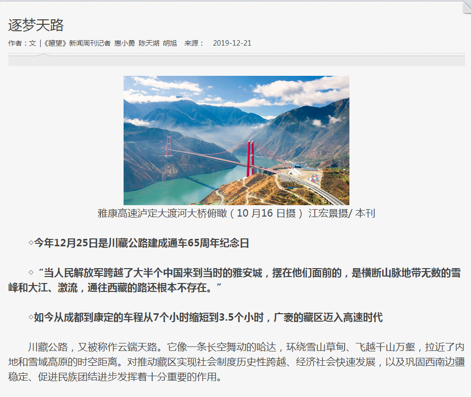 2019年12月21日,新華社旗下《瞭望》新聞周刊推出川藏公路建成通車65周年特別報(bào)道《逐夢(mèng)天路》,文章回顧了川藏公路65年來的歷史變遷,通過采訪我司總工程師牟廷敏、隧道分院高級(jí)工程師鄭建國等專家,對(duì)川藏公路上我司勘察設(shè)計(jì)的雀兒山隧道、雅康高速二郎山隧道、汶馬高速汶川克枯大橋等品質(zhì)工程進(jìn)行交互剪影報(bào)道,充分展現(xiàn)了我司繼承和弘揚(yáng)“兩路”精神,潛心“科技賦能?一路向前”,為川藏公路由通到暢,升級(jí)提效保駕護(hù)航的奮斗者形象。