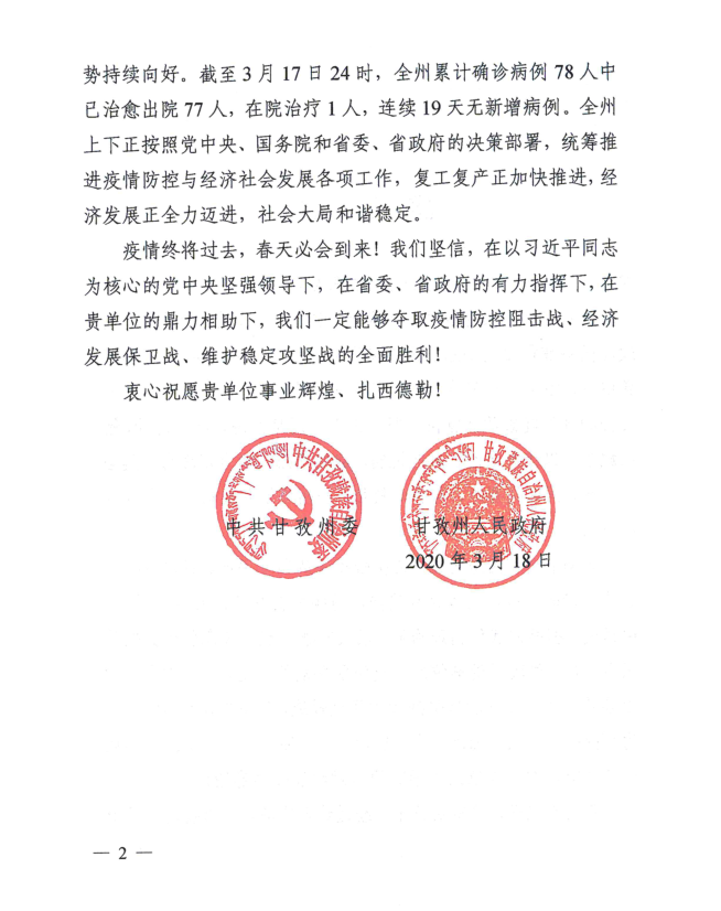 我公司在新冠肺炎疫情防控期間,積極發(fā)揮自身優(yōu)勢,勇?lián)鐣?zé)任,對甘孜州捐贈了抗疫物資。3月18日,甘孜州委、州人民政府送來感謝信,對我公司在抗擊疫情的緊要關(guān)頭,心系甘孜、情牽甘孜,積極捐獻、火速馳援的義舉表示感謝。