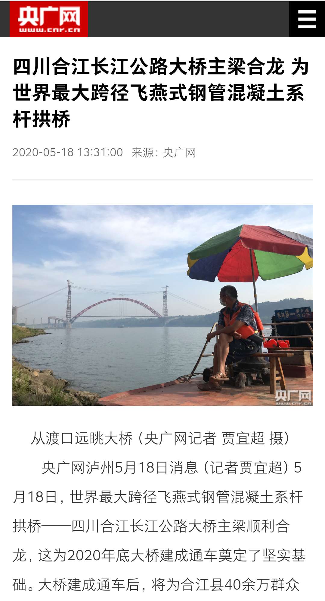 央廣網:四川合江長江公路大橋主梁合龍 為世界最大跨徑飛燕式鋼管混凝土系桿拱橋