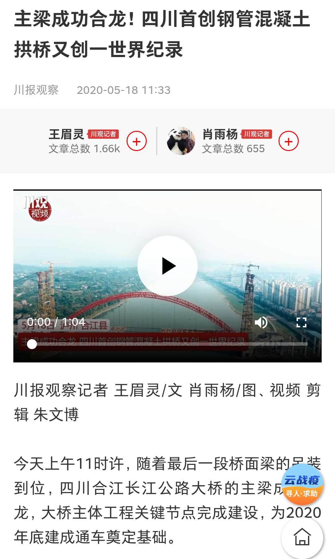 當天,人民網、人民日報、央廣臺、中新社、中國交通報、川臺、四川日報、四川經濟日報、四川新聞頻率、中國網、四川新聞網、四川交通廣播、四川工人日報、成都日報、華西都市報社、成都商報、成都電視臺等20余家主流媒體,趕赴合龍現(xiàn)場集中報道,現(xiàn)場采訪了我公司設計代表汪洋,詳細報道了大橋在設計上的技術創(chuàng)新和突出亮點。各大主流媒體密集發(fā)布專題報道和現(xiàn)場視頻,新華社、新華網、新浪、網易、騰訊、今日頭條、澎湃新聞、光明日報、神鳥知訊、東方財富網及地方媒體100余家轉發(fā)報道,微博大V、抖音等新媒體也紛紛轉發(fā),報道呈刷屏之勢,迅速傳遍互聯(lián)網,成功展示了公司在橋梁技術領域的一流實力,進一步樹立了公司良好的社會形象,擴大了影響力。
