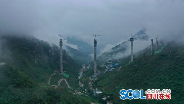 金陽河特大橋所在地不僅峽谷深切,而且地震烈度高,需按9級設防。為了讓大橋順利跨越溝谷,3個高度超過100米的墩柱,采用了四川公路設計院自創(chuàng)的鋼管混凝土組合格構墩——連續(xù)鋼構世界第一高墩雅西高速臘八斤大橋的“同款”,減少自重的同時又增加了承載力度。其中,金陽河特大橋的6號主墩高達196米,相當于65層高樓,比臘八斤大橋最高墩還要高13.5米。