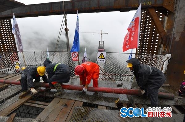 四川鐵投四川路橋金陽河特大橋項目部工程科科長俞坤升介紹,針對大橋建設難點,項目部自行研發(fā)多項“黑科技”,力克安全風險和技術難關。比如,項目研發(fā)的自爬式多功能提升系統(tǒng),可實現(xiàn)鋼管安裝、C80澆筑、外包及隔板施工同步作業(yè),節(jié)約工期3個月,并將重達45噸的鋼管輕松吊到墩頂。