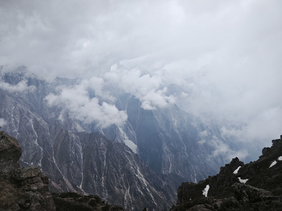下午,借助繩索的輔助,我們驚險(xiǎn)地翻越了另一處懸崖。傍晚,抵達(dá)甘龍池畔扎營(yíng)。身體早已達(dá)到極限,匆匆吃完冰冷的食物,倒頭便睡。然而,老天爺似乎還想給我們最后一課。剛?cè)胨痪茫岷诘囊箍罩忻腿徽ㄩ_(kāi)刺眼的閃電,滾滾驚雷仿佛就在頭頂炸響!緊接著,豆大的暴雨傾盆而下,無(wú)情地抽打著單薄的帳篷。我們蜷縮在睡袋里,聽(tīng)著狂暴的雨聲和呼嘯的風(fēng)聲,祈禱著暴雨不要下得太久。
