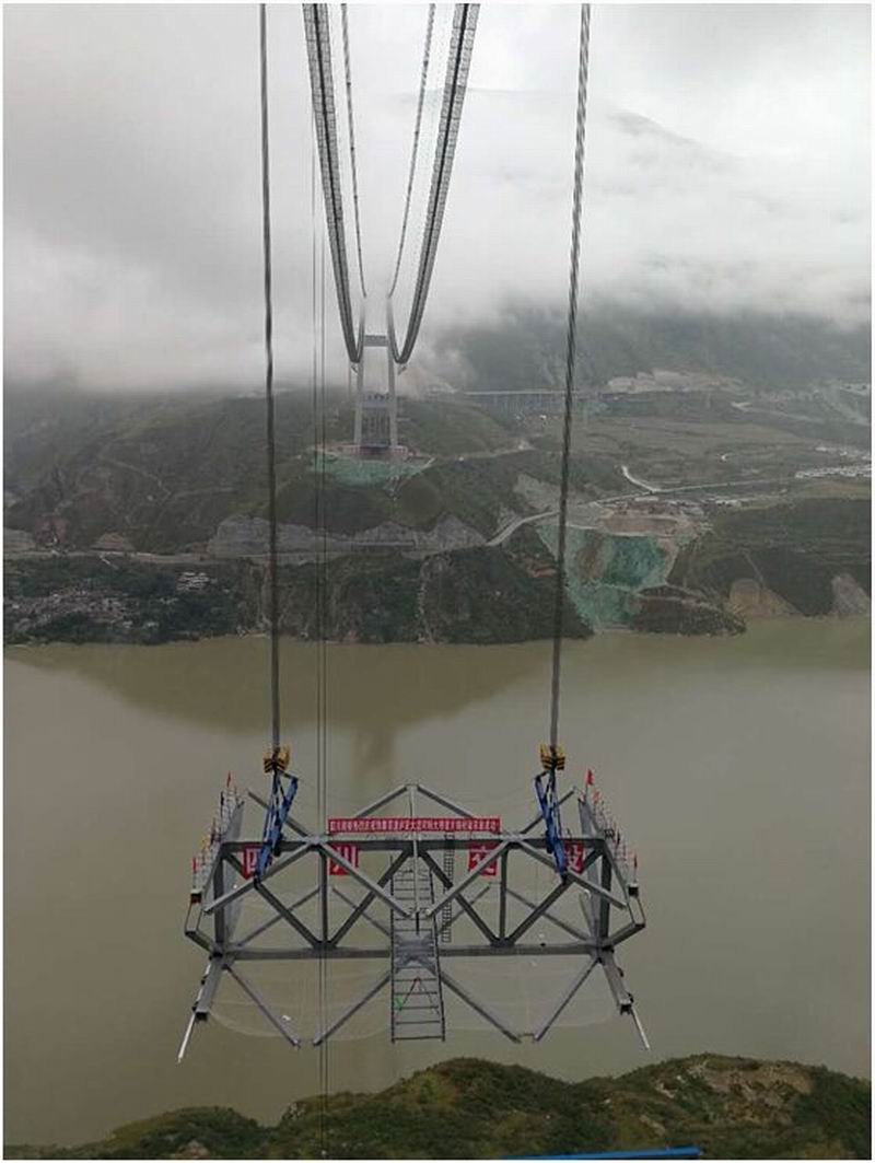 該橋是主跨1100米的超大跨懸索橋,被譽(yù)為“川藏第一橋”。主梁用鋼量為9095噸,采用型鋼桁架,為帶豎腹桿的華倫式結(jié)構(gòu),桁寬27m、桁高8.2m;主梁節(jié)間長(橫梁間距)10m。橋道系采用縱向工字梁與混凝土橋面板的鋼-混組合結(jié)構(gòu)形式。