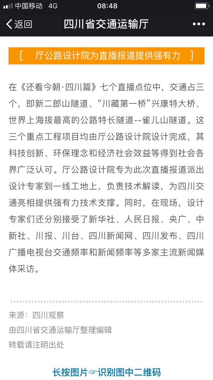 26日上午,四川交通特別是川藏線建設(shè)迎來(lái)重大節(jié)點(diǎn),即:新二郎山隧道實(shí)現(xiàn)雙向貫通、“川藏第一橋”興康特大橋首段鋼桁梁主梁吊裝成功、世界上海拔最高的公路特長(zhǎng)隧道--雀兒山隧道正式建成通車。央視推出的大型特別節(jié)目《還看今朝.四川篇》用近1小時(shí)直播這三件事。我院設(shè)計(jì)完成了這三個(gè)工程,并專為此次央視直播報(bào)道派出設(shè)計(jì)專家到一線工地上,負(fù)責(zé)技術(shù)解讀,為四川交通亮相提供強(qiáng)有力技術(shù)支撐,充分展現(xiàn)我院綜合實(shí)力。