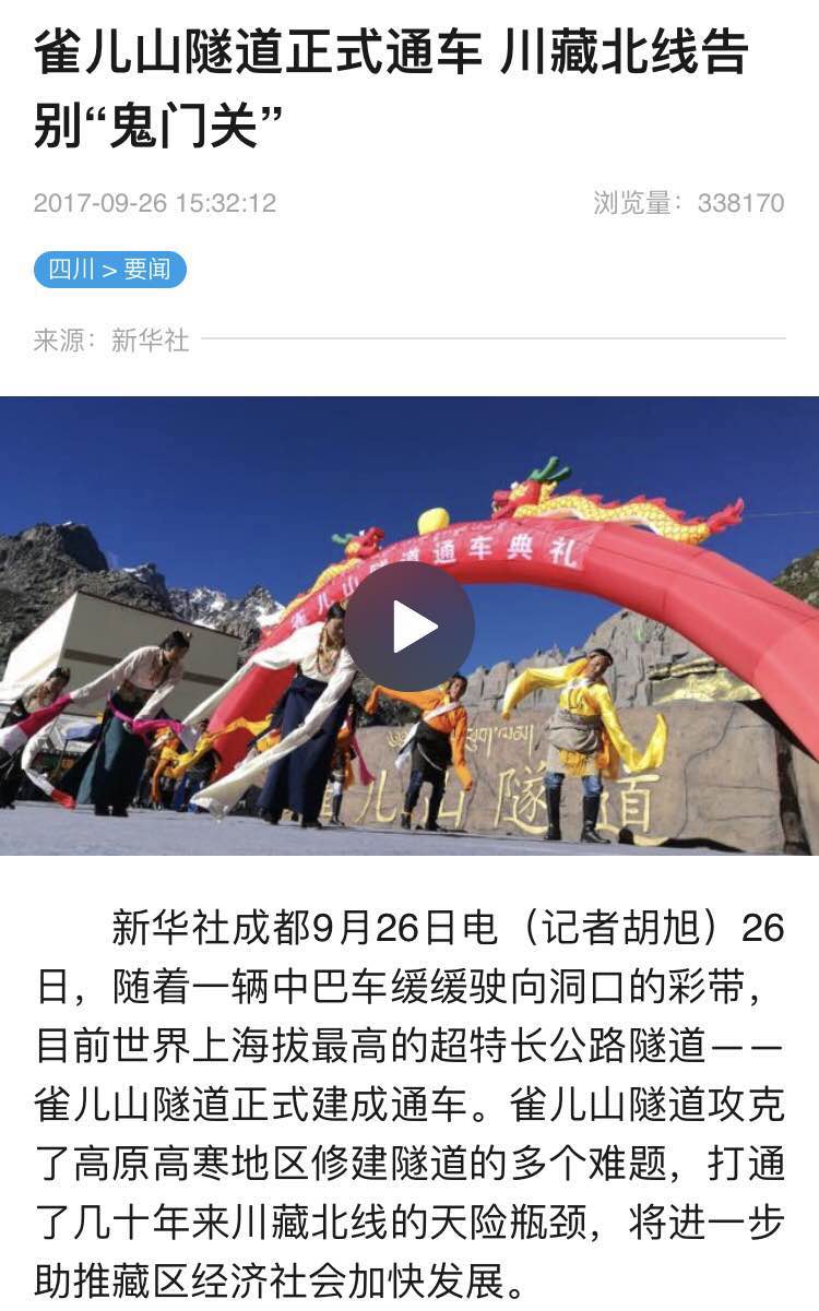 1.新華社手機(jī)客戶端標(biāo)題:雀兒山隧道正式通車 川藏北線告別“鬼門關(guān)”(9月26日)