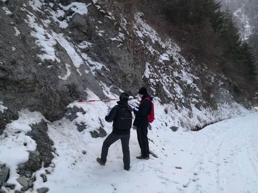 近日,我院派相關(guān)專業(yè)部門,對茂縣“6.24”地質(zhì)災(zāi)害S448疊溪至松坪溝公路恢復(fù)重建進行了現(xiàn)場踏勘,并對全線進行了外業(yè)調(diào)查。項目組調(diào)查人員冒著飛石、滑坡等危險,在冰天雪地中跋山涉水,克服重重困難,對全線道路受災(zāi)情況、重建方案逐一調(diào)查,收集到寶貴的原始資料,為后續(xù)設(shè)計提供支撐。