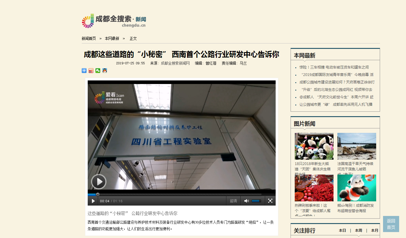 7月25日,成都市新聞門戶網(wǎng)站——成都全搜索網(wǎng)以《成都這些道路的“小秘密” 西南首個公路行業(yè)研發(fā)中心告訴你》為題,采用短視頻與長篇圖文相結(jié)合的形式介紹了我司交通運輸部公路建設(shè)與養(yǎng)護(hù)技術(shù)材料及裝備行業(yè)研發(fā)中心在路面再生、排水降噪、綠色環(huán)保、應(yīng)急處置等研發(fā)領(lǐng)域的多項創(chuàng)新及其在成都的應(yīng)用實例。