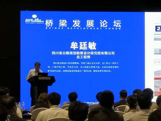 6月14日下午,來(lái)自國(guó)內(nèi)外橋梁界的300多名專(zhuān)家和參會(huì)代表參加橋梁發(fā)展論壇。論壇開(kāi)幕式上,隆重進(jìn)行了第36屆國(guó)際橋梁大會(huì)(IBC)獲獎(jiǎng)橋梁頒獎(jiǎng)儀式,我公司設(shè)計(jì)的合江長(zhǎng)江一橋和瀘定大渡河大橋分別獲得被譽(yù)為橋梁界“諾貝爾獎(jiǎng)”的喬治•理查德森獎(jiǎng)和古斯塔夫•林德撒爾獎(jiǎng),中國(guó)工程院鄭皆連院士、歐進(jìn)萍院士及中國(guó)公路學(xué)會(huì)副理事長(zhǎng)兼秘書(shū)長(zhǎng)劉文杰、中國(guó)公路學(xué)會(huì)副理事長(zhǎng)張喜剛分別為公司獲獎(jiǎng)項(xiàng)目頒獎(jiǎng)。牟廷敏總工程師受邀在論壇發(fā)表題為《四川瀘定大渡河興康大橋技術(shù)創(chuàng)新》的主旨演講,全面介紹了公司設(shè)計(jì)的雅康高速瀘定大渡河興康大橋(主橋?yàn)?/span>1100米單跨鋼桁梁懸索橋)的技術(shù)創(chuàng)新情況,公司的技術(shù)創(chuàng)新能力和研發(fā)實(shí)力獲得國(guó)內(nèi)外同行的高度認(rèn)同和廣泛贊譽(yù)。論壇結(jié)束后,牟廷敏總工程師接受了中央電視臺(tái)、人民網(wǎng)等媒體的專(zhuān)訪(fǎng)。