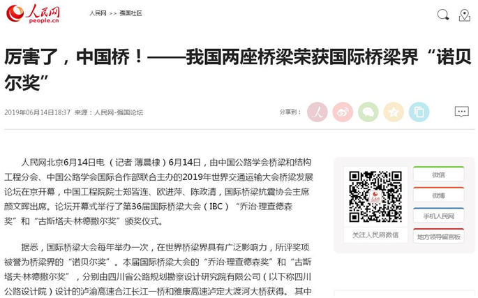 2.人民網(wǎng)——《厲害了,中國橋!——我國兩座橋梁榮獲國際橋梁界“諾貝爾獎”》
