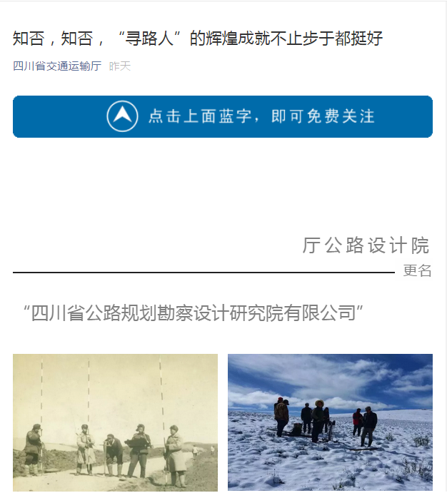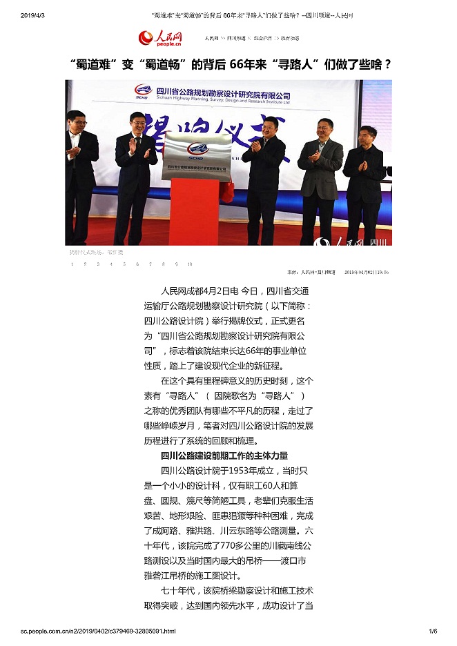 4月2日,公司成功舉行揭牌儀式。省交通運輸廳微信公眾號和《人民網(wǎng)》以此為由頭,分別以《知否,知否,“尋路人”的輝煌成就不止步于都挺好》和《蜀道難”變“蜀道暢”的背后 66年來“尋路人”們做了些啥?》為題,圖文并茂深度報道了公司66年發(fā)展歷程和輝煌成就,充分展示了我公司作為“四川公路建設前期工作的主體力量”、“山區(qū)公路勘察設計技術創(chuàng)新的行業(yè)典范”、“不畏艱險服務社會的技術先鋒”、“溝通世界的對外交流合作伙伴”等方面突出業(yè)績。廳微信公眾號還用了院歌《尋路人》MTV視頻。