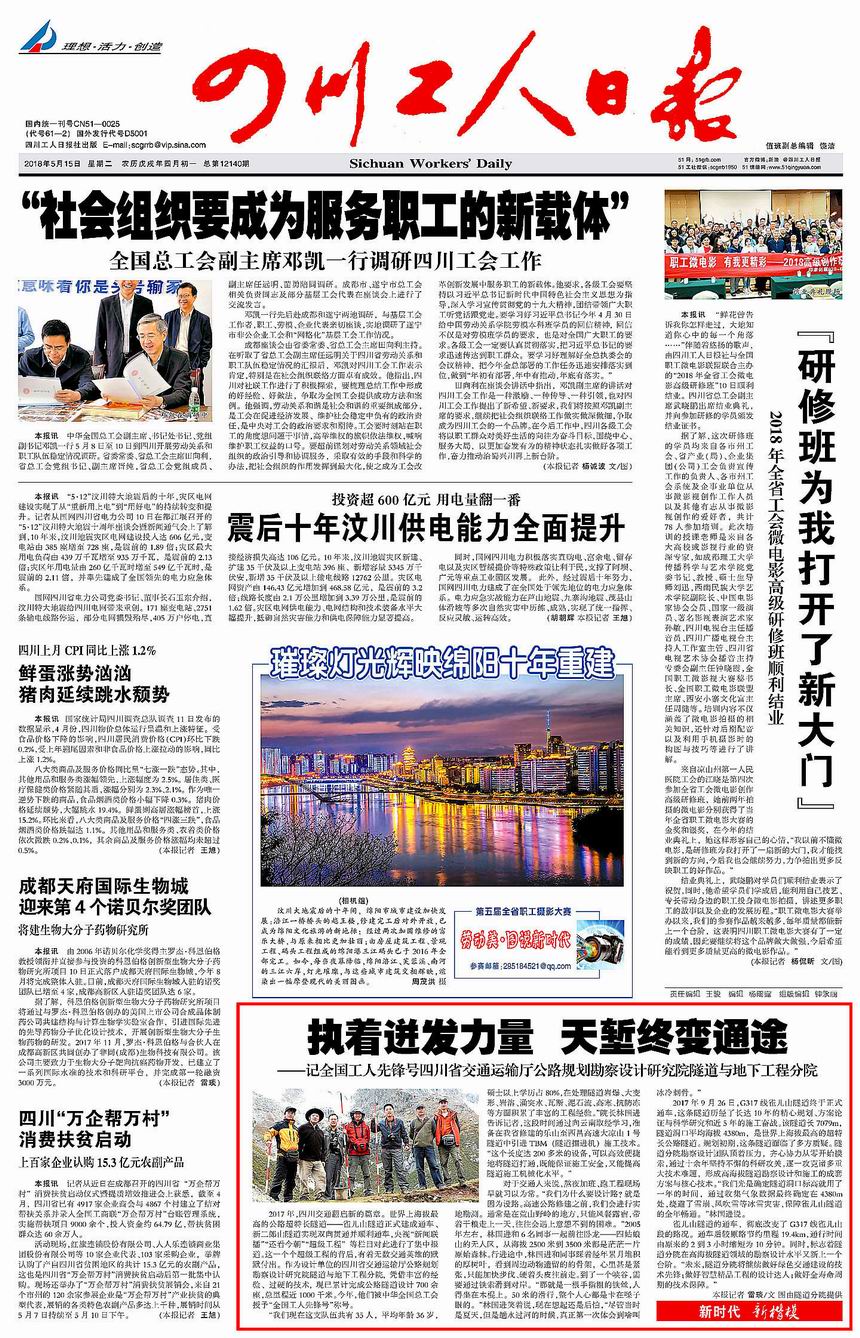近日,四川省總工會在成都組織召開了2018年四川省慶祝“五一”國際勞動節(jié)暨表彰大會,被中華全國總工會授予“全國工人先鋒號”的我院隧道與地下工程分院應(yīng)邀參加并上臺接受表彰。5月15日,《四川工人日報》頭版“新時代、新楷模”專欄刊發(fā)題為《執(zhí)著迸發(fā)力量,天塹終變通途——記全國工人先鋒號四川省交通運(yùn)輸廳公路規(guī)劃勘察設(shè)計研究院隧道與地下工程分院》專題報道,對該分院先進(jìn)事跡、突出成果以及勘察設(shè)計業(yè)績等方面的進(jìn)行了宣傳,重點報道了該分院設(shè)計超級工程雀兒山隧道的先進(jìn)事跡,展現(xiàn)了我院克難攻堅、奮發(fā)有為的精神面貌。