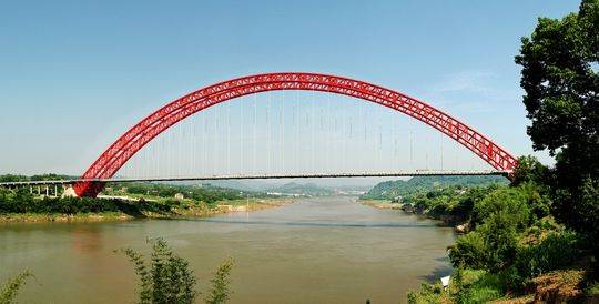 位于四川瀘州市合江縣境內(nèi),全長841m,橋?qū)?8m, 2013年6月建成通車。該橋在新的結(jié)構(gòu)體系,施工技術(shù)等方面的研究與開發(fā),形成了大跨鋼管混凝土拱橋的成套建造技術(shù),由此成為鋼管混凝土拱橋發(fā)展史上的里程碑。