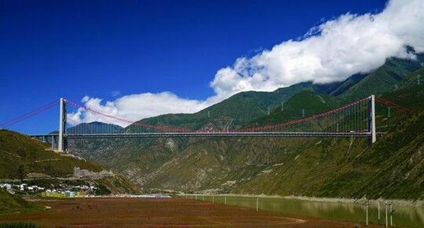 四川瀘定大渡河大橋位于雅安至康定高速公路瀘定縣境內(nèi),1100m單跨鋼桁梁懸索橋,地震烈度9度,是建設(shè)在高海拔、高地震烈度區(qū)、復(fù)雜風(fēng)場(chǎng)環(huán)境下的超級(jí)工程。大橋采用波形鋼腹板組合橫梁、鉸接式耗能型中央扣提高抗震性能,采用人字型抗滑樁和框架錨索防止次生地質(zhì)災(zāi)害,并巧妙處理了大橋隧道錨碇與公路隧道相互干擾的復(fù)雜關(guān)系,這一系列創(chuàng)新設(shè)計(jì),使其成為極其復(fù)雜條件下特大跨橋梁建設(shè)的示范工程。近距離欣賞大橋與峽谷美景,也是人類工程技術(shù)與大自然完美結(jié)合的典范。