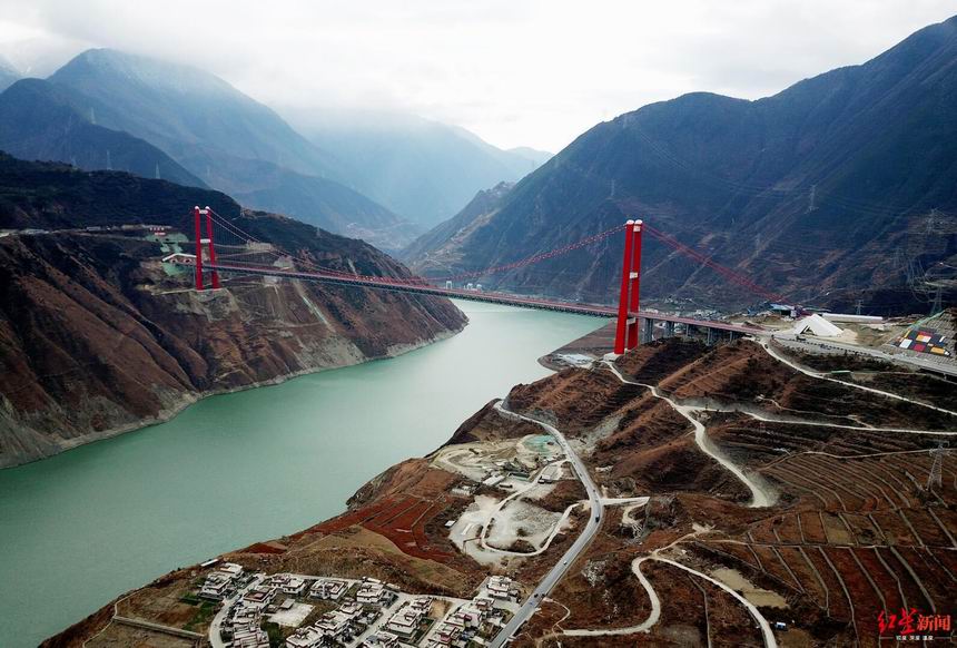 瀘定大渡河大橋由四川交投藏高公司投資建設(shè),主橋為1100米單跨鋼桁梁懸索橋,已于2018年12月通車。從遠(yuǎn)處眺望,峽谷間橫亙鮮艷的一抹紅。它不僅成為新晉的“網(wǎng)紅打卡地”,更成為當(dāng)?shù)氐臉?biāo)志性建筑。