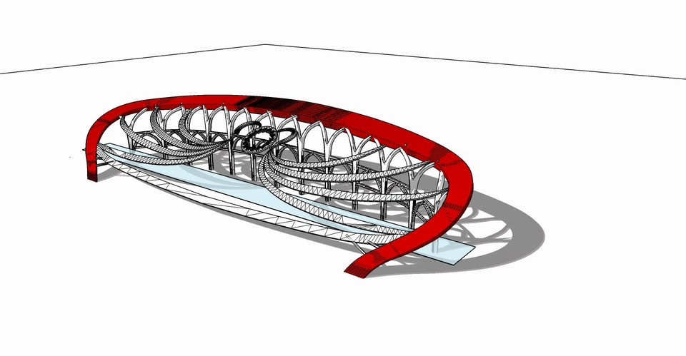 收費(fèi)棚方案——錦。設(shè)計(jì)靈感源自于紅色飄帶,象征錦繡天府。除此之外,造型還融入了多個(gè)成都相關(guān)元素。飄帶中間的構(gòu)件象征著“太陽神鳥”,太陽神鳥連同其他構(gòu)件,形似太陽神鳥的鳥巢,意味著太陽神鳥的發(fā)現(xiàn)地。從另外一側(cè)看,收費(fèi)棚形似將要綻放的木芙蓉花 ,象征“蓉城”。