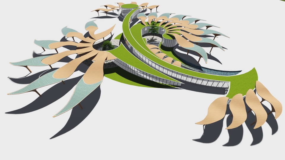 服務(wù)區(qū)方案——印。本方案的設(shè)計(jì)宗旨與前幾個(gè)方案有所不同,著重突出“簡(jiǎn)潔、綠色、高效”。服務(wù)區(qū)綜合樓將金沙太陽神鳥的造型加以提煉和變化,停車棚抽象出的羽翼環(huán)繞四周, 使其空中俯瞰猶如印在天府大地的太陽神鳥圖騰。 同時(shí),又運(yùn)用了種植屋面、太陽能反射玻璃、雨水回收系統(tǒng)、光伏太陽能發(fā)電板等綠色建筑先進(jìn)技術(shù)。