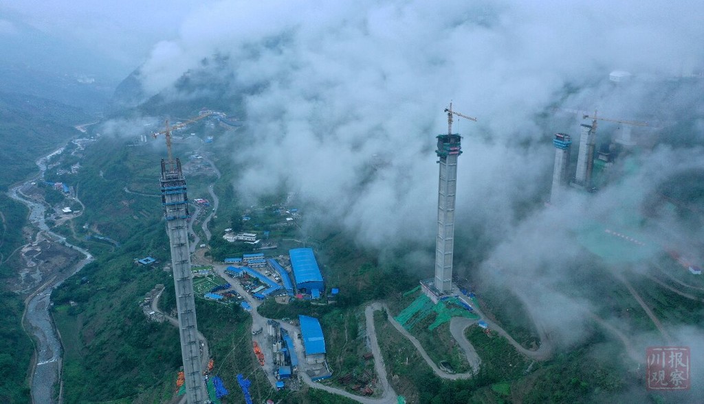 6月23日下午13時許,隨著最后一泵混凝土的澆筑,金陽河特大橋高達196米的6號主墩封頂,世界最高連續(xù)剛構橋鋼管混凝土格構空心墩的高度紀錄由此刷新,成為中國橋梁建設的最新豐碑。