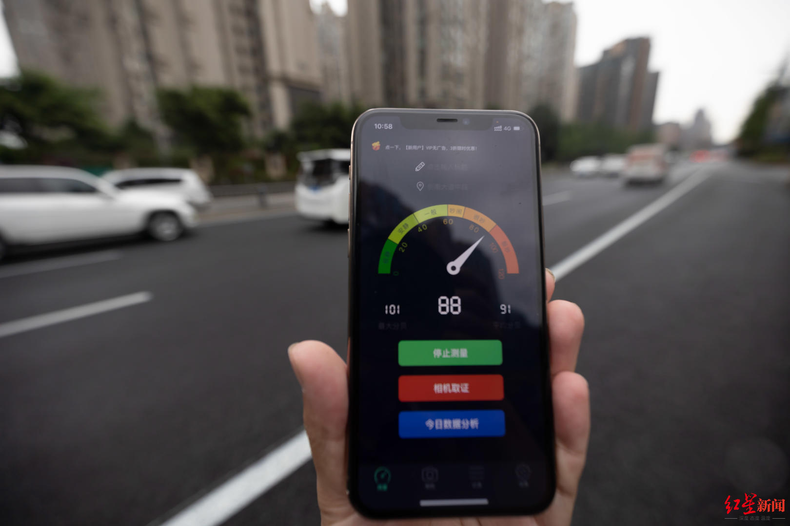 記者在現(xiàn)場(chǎng)用手機(jī)中的“噪聲檢測(cè)儀”軟件在道路兩側(cè)進(jìn)行了簡(jiǎn)單測(cè)試。實(shí)驗(yàn)時(shí)間各1分鐘,手機(jī)離路面約50厘米。從測(cè)試結(jié)果來(lái)看,鋪設(shè)降噪路面的道路最高噪音為103分貝,平均為87分貝,未鋪設(shè)降噪路面的道路噪音最高為109分貝,平均為92分貝,噪音平均降低了5分貝。