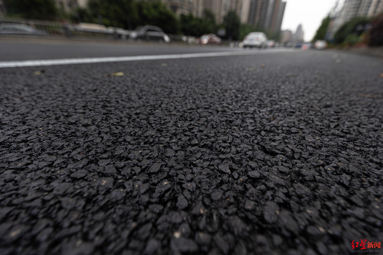 上午10時(shí)許,紅星新聞?dòng)浾邅?lái)到劍南大道與盛邦街交叉口的天橋上,從上向下可以明顯看到,出城方向路面較進(jìn)城方向路面顏色要深一些,車輛行駛過(guò)后的聲音也比常規(guī)路面更小。