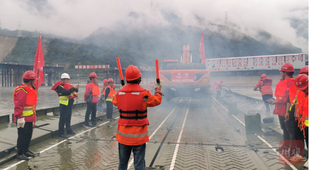 全國首次應用動力舟橋搭建移動船運送大型機具