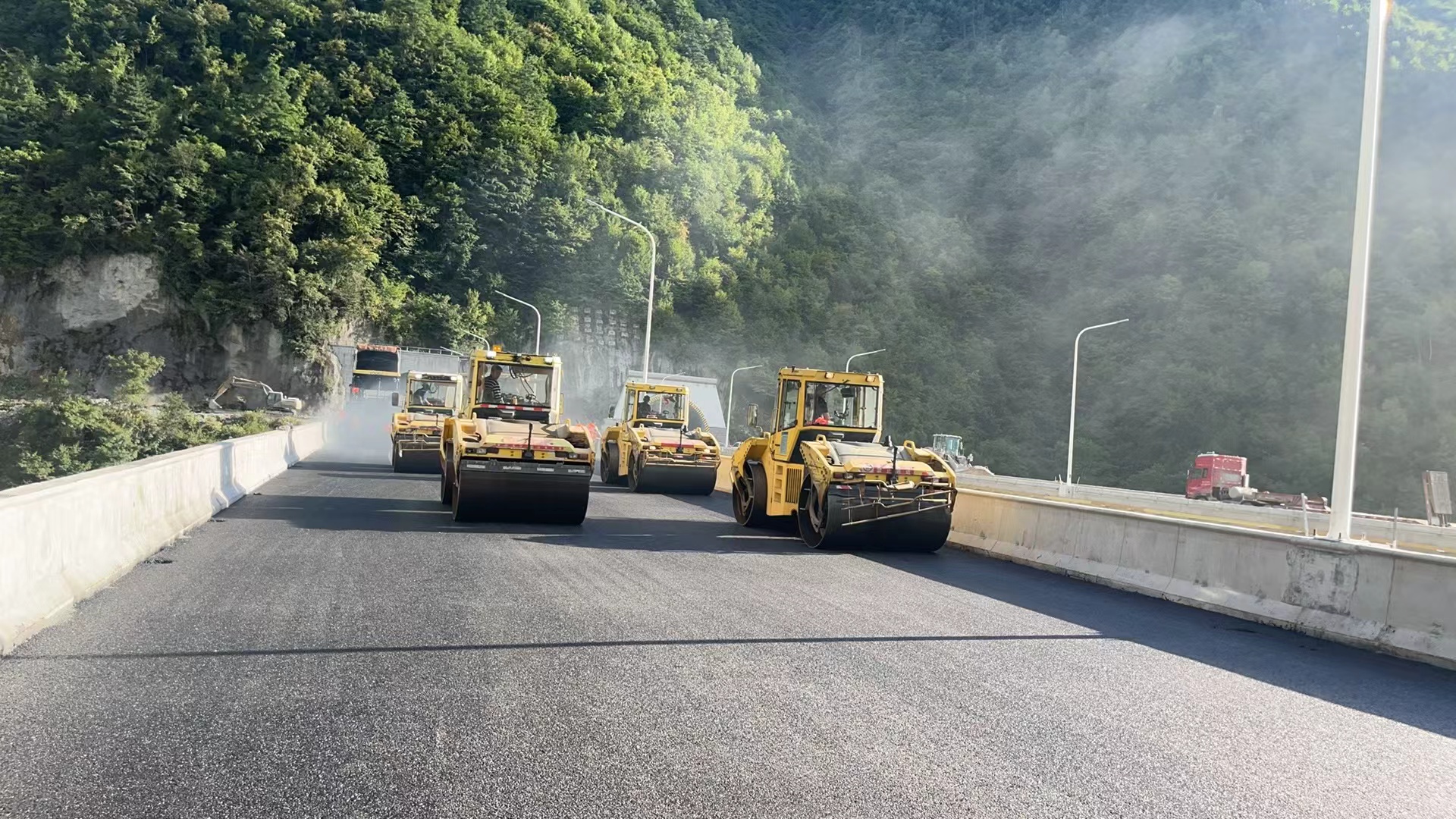 此次鋪筑的路段位于四川省綿陽市平武至木座段,地處龍門山斷裂帶與虎牙斷裂帶交匯區(qū)域,地質(zhì)條件復(fù)雜,施工難度大。面對高海拔地區(qū)氣候多變、有效窗口期短等挑戰(zhàn),參建團(tuán)隊(duì)緊密協(xié)作,引入大型攤鋪機(jī)、雙光輪壓路機(jī)等先進(jìn)設(shè)備,應(yīng)用智能壓實(shí)、溫拌瀝青等新工藝,對瀝青混合料的拌合、運(yùn)輸、攤鋪、碾壓等各環(huán)節(jié)實(shí)施精細(xì)化管控。通過倒排工期、加大資源投入、24小時(shí)輪班連續(xù)作業(yè)等方式,全力保障工程進(jìn)度。同時(shí),依托完善的質(zhì)量監(jiān)督體系,借助信息化手段進(jìn)行全過程實(shí)時(shí)監(jiān)控,確保路面質(zhì)量達(dá)到高標(biāo)準(zhǔn)要求。