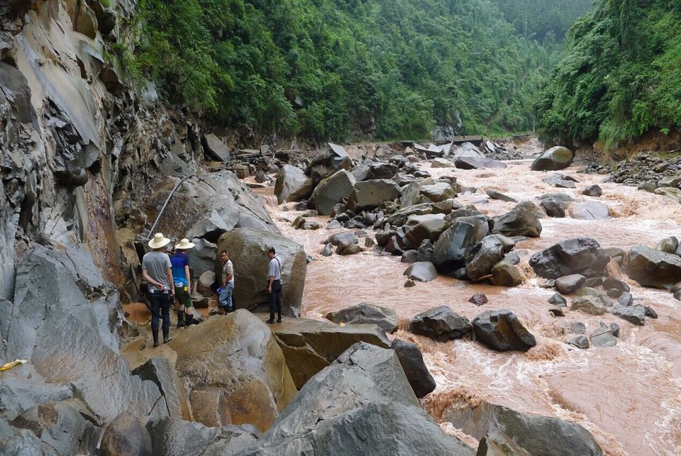 8月17日清晨6:00,搶險小組出發(fā)前往災(zāi)區(qū)現(xiàn)場,到達(dá)災(zāi)區(qū)后立即開始進(jìn)行踏勘排查。由于道路被泥石流及滑坡沖毀嚴(yán)重,局部路段被完全掩埋,靠山側(cè)堆滿厚厚的泥漿,靠河側(cè)則是臨河懸空陡壁,高差約10至20米,大家只能行走在很窄的原路混凝土護(hù)欄頂部,加之路面濕滑,稍不注意就會掉入山谷。不僅如此,靠山側(cè)邊坡巖土松動,崩塌落石時有發(fā)生,大家通過時必須高度警惕、相互提醒,觀察無異常后快速通過。同時,多數(shù)臨河路段擋墻被沖毀,路面板大面積懸空,根據(jù)調(diào)查需要,必須在懸空面板上進(jìn)行實地調(diào)查及測量,隨時面臨路面板垮塌掉落的危險。搶險小組幾位成員都有不同程度的擦傷扭傷。