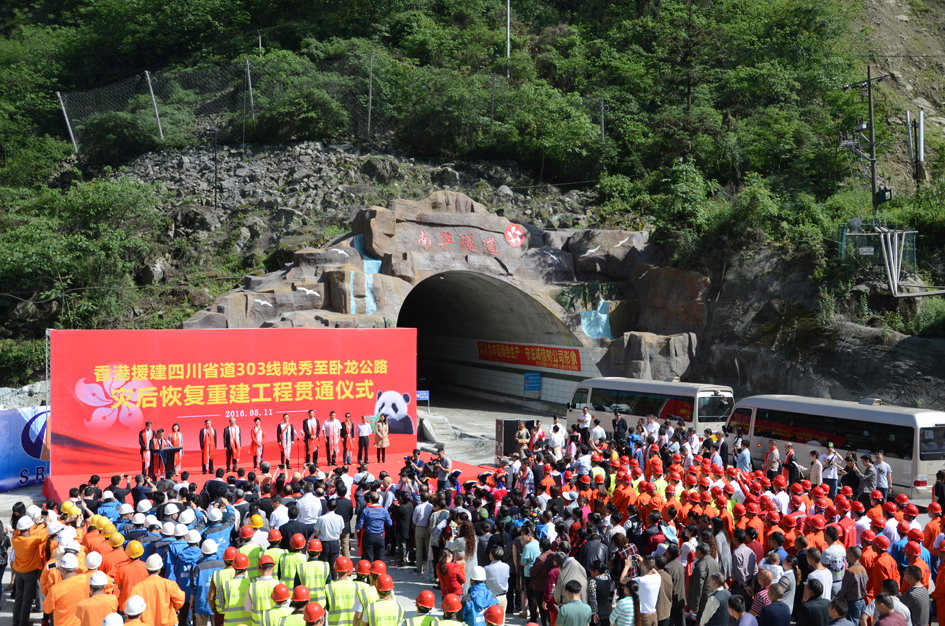 5月11日,由我院監(jiān)理、香港特別行政區(qū)援建的省道303線映(秀)臥(龍)路災(zāi)后恢復(fù)重建工程貫通儀式在南華隧道入口處舉行。省交通運(yùn)輸廳黨組成員、總工程師陳樂(lè)生主持儀式,香港特區(qū)政府政務(wù)司司長(zhǎng)林鄭月娥致辭,省政府副秘書長(zhǎng)趙衛(wèi)平宣布貫通。