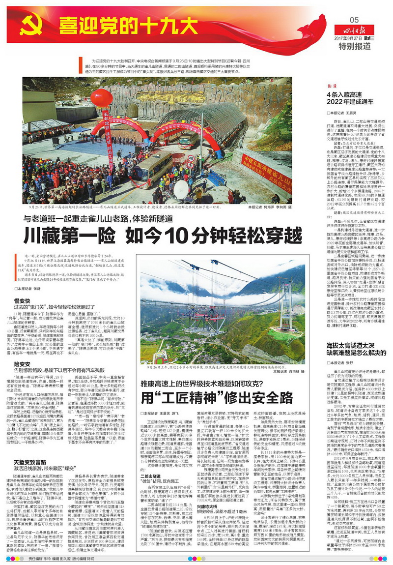 新聞標題:同一天 雀兒山隧道通車 二郎山隧道貫通 天險變通途(9月27日頭版整版)
