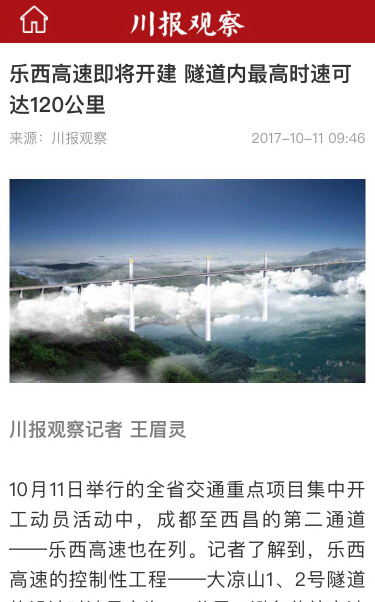 8.樂西高速即將開建 隧道內(nèi)最高時(shí)速可達(dá)120公里(川報(bào)觀察10月11日)