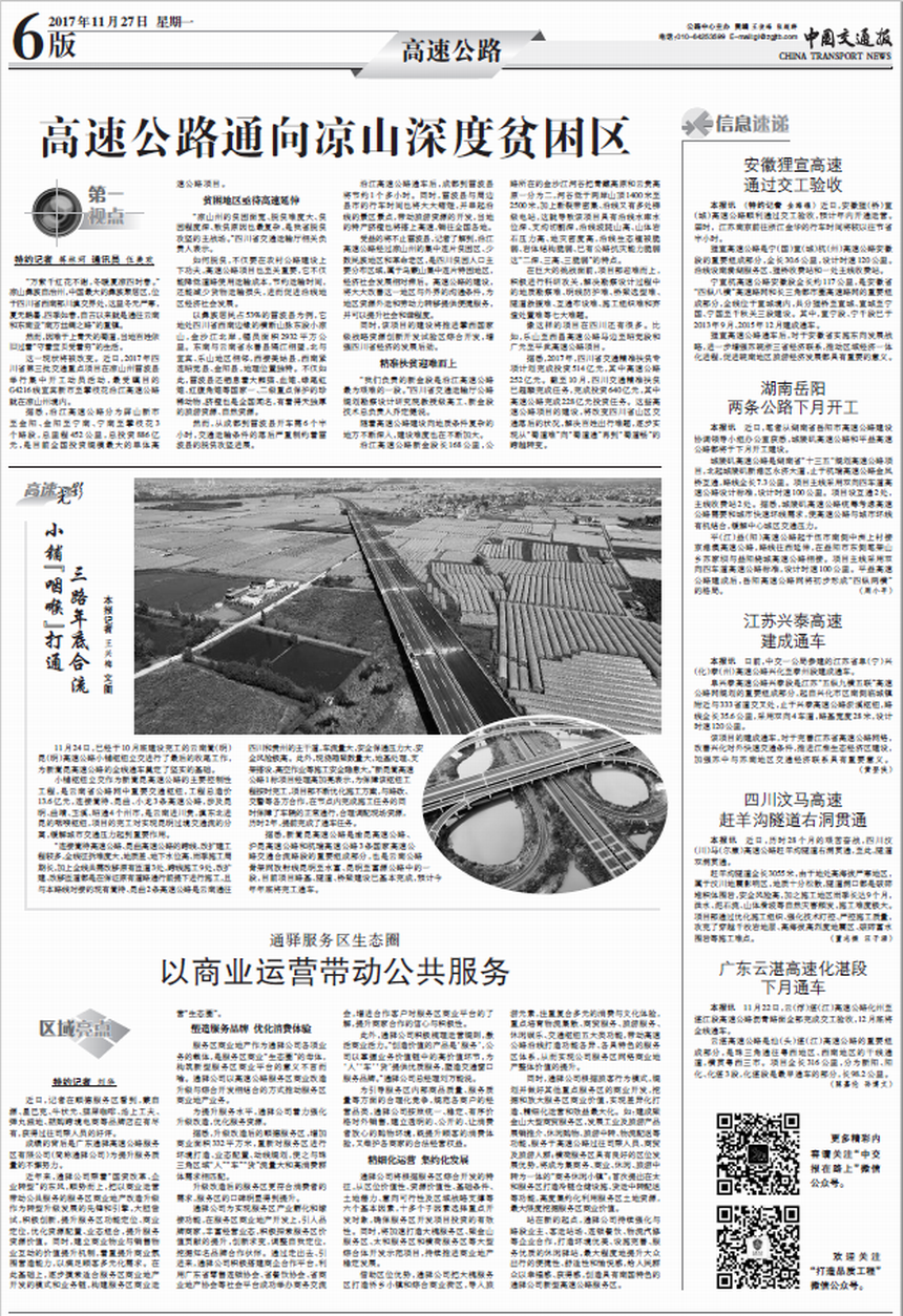 11月27日,《中國交通報(bào)》第6版以《高速公路通向涼山深度貧困區(qū)》為題,報(bào)道了沿江高速公路建設(shè)的重大意義,助推涼山地區(qū)經(jīng)濟(jì)社會(huì)發(fā)展和精準(zhǔn)扶貧,增強(qiáng)四川經(jīng)濟(jì)發(fā)展后勁。我院專家接受采訪,他說:“我們負(fù)責(zé)的新金段是沿江高速公路最為艱難的一段。”同時(shí)專業(yè)解讀了新金段勘察設(shè)計(jì)加強(qiáng)科技攻關(guān),克服重重困難,解決了復(fù)雜的地質(zhì)地形條件等難題。
