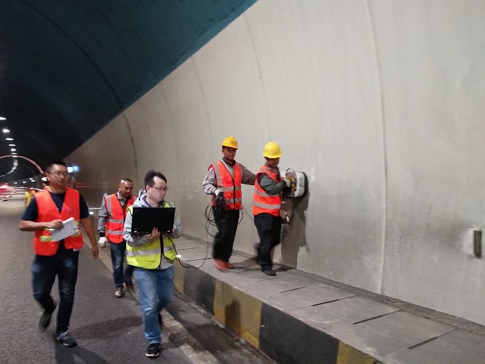 該隧道位于G4215蓉遵高速公路成仁段。經(jīng)前期現(xiàn)場(chǎng)調(diào)查,根據(jù)隧道表觀病害特征和分布區(qū)段,我院擬定了詳細(xì)的檢查方案??紤]到該隧道日交通量3萬(wàn)余輛,為保證檢測(cè)人員的作業(yè)安全和最大限度降低對(duì)隧道正常運(yùn)營(yíng)的影響,經(jīng)與高速交警及交通執(zhí)法等部門(mén)充分協(xié)調(diào)后,決定采用通宵檢測(cè)模式完成該項(xiàng)目的專(zhuān)項(xiàng)“體檢”工作。